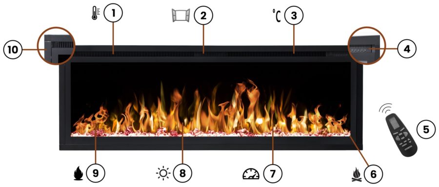 - 6 kolorów płomienia./2 rodzaje paleniska w zestawie: polana, kryształy./10 kolorów podświetlenia paleniska./5 poziomów jasności paleniska
