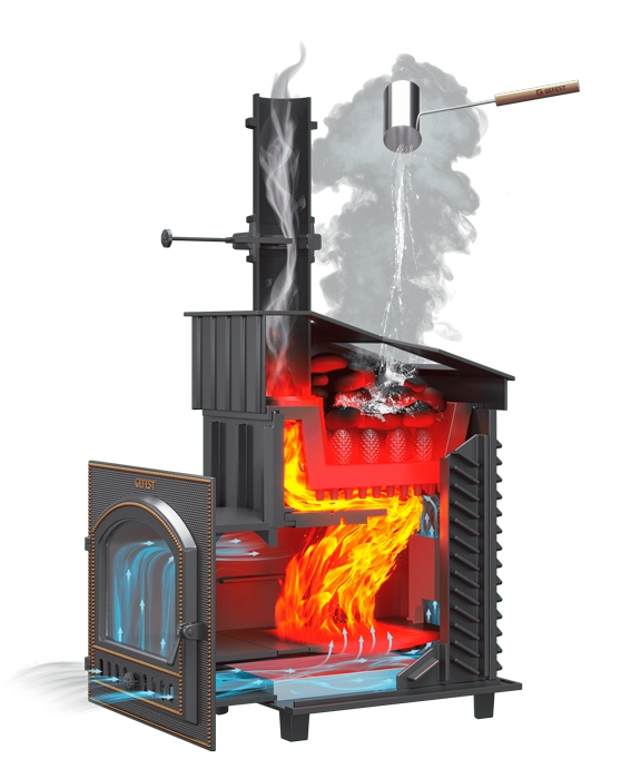 Piec GFS-3K z unikalną grzałką bezpośredniego ogrzewania do uzyskiwania lekkiej drobnej pary, która jest niezbędna w rosyjskim reżimie łaźni. Dzięki innowacyjnej konstrukcji piekarnik ma gwarancję wejścia w tryb w ciągu 60 minut.