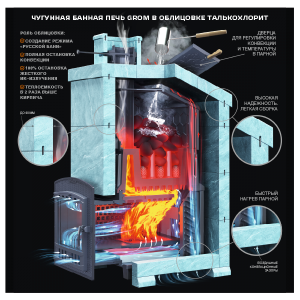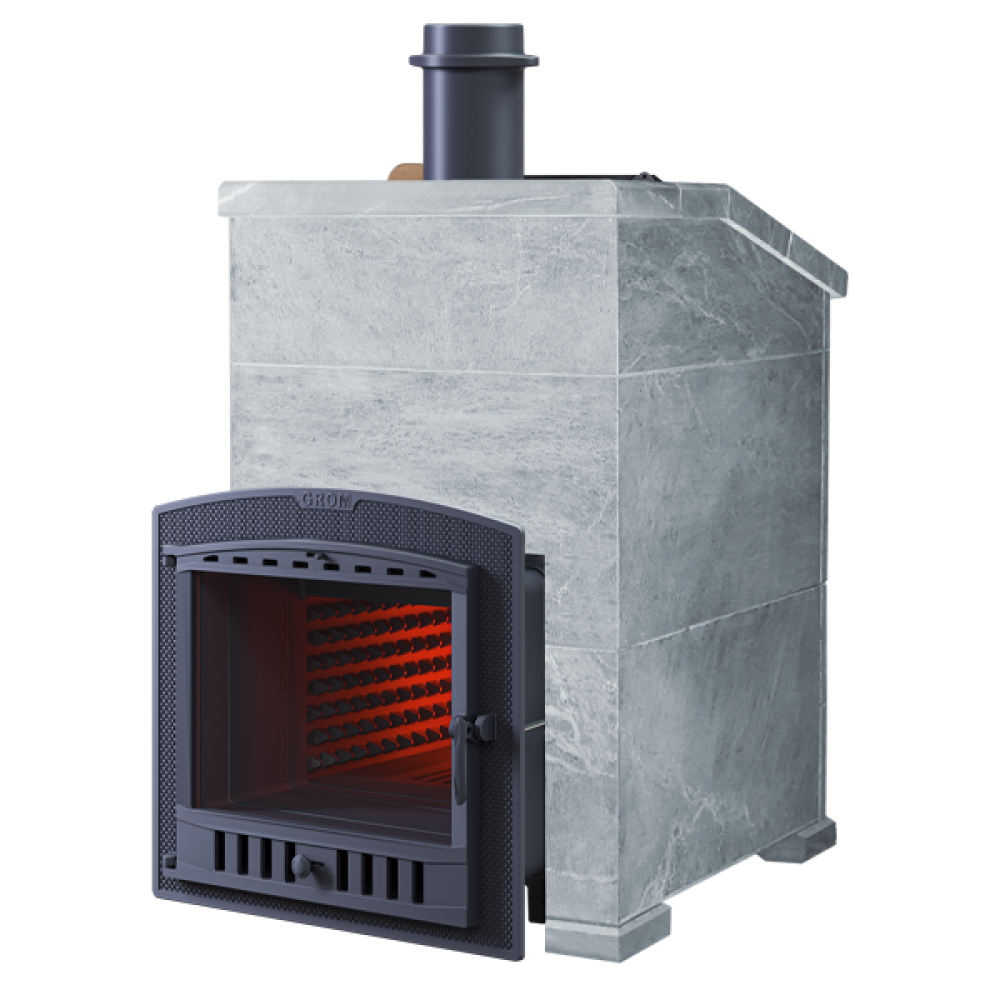 Piece linii Grom dostarczane są z żeliwną skrzynią do montażu na nagrzewnicy oraz żeliwną rurą rozruchową o długości 500 mm. Podwyższona waga, grubość ścian bocznych 14 mm zwiększają niezawodność i zdolność akumulacji ciepła, a dla szybkiego nagrzania łaźni parowej ściany boczne wyposażone są w żebra konwekcyjne nie tylko na zewnątrz, ale również na powierzchni wewnętrznej .