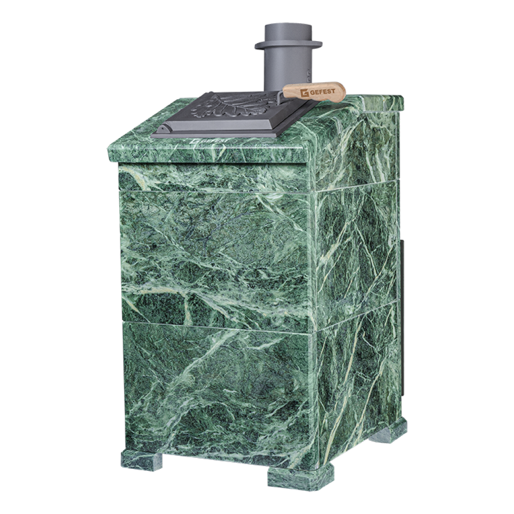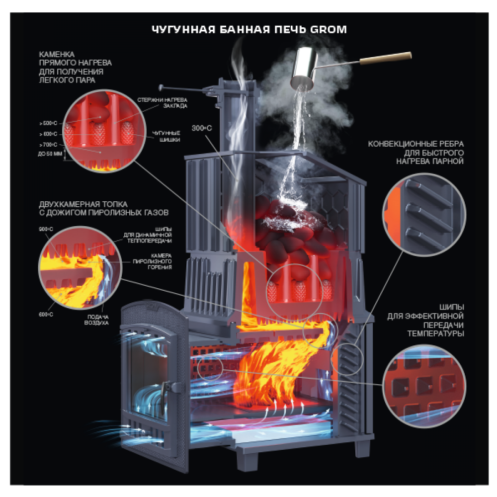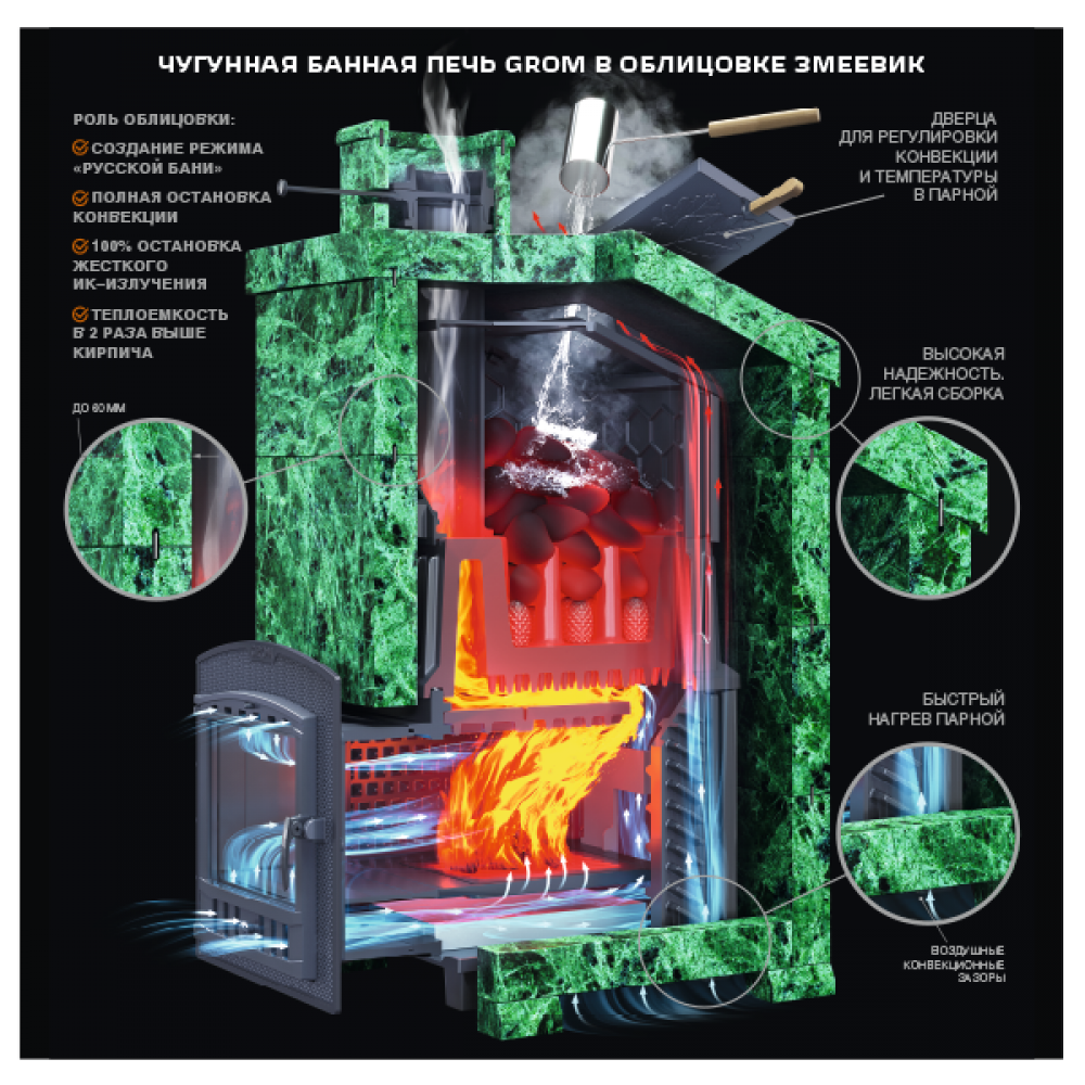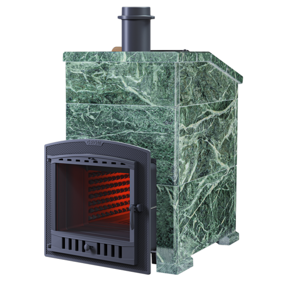 Piece linii Grom dostarczane są z żeliwną skrzynią do montażu na nagrzewnicy oraz żeliwną rurą rozruchową o długości 500 mm. Podwyższona waga, grubość ścian bocznych 14 mm zwiększają niezawodność i zdolność akumulacji ciepła, a dla szybkiego nagrzania łaźni parowej ściany boczne wyposażone są w żebra konwekcyjne nie tylko na zewnątrz, ale również na powierzchni wewnętrznej .