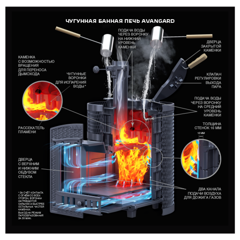Całkowicie żeliwna zamknięta Kamenka pieca Avangard - jest główną wytwornicą pary. Nagrzewa się do 900 stopni, a gdy wpadnie na nią woda, jest w stanie w nieskończoność wytwarzać dużą ilość drobno rozproszonej lekkiej pary. Dzięki grubości ścianki 60 mm ma zwiększoną pojemność cieplną i niezrównaną niezawodność.Zamknięty grzejnik pieca Avangrad jest wyposażony w 2 lejki z doprowadzeniem wody na różne poziomy, a także w zawór wylotowy pary na drzwiach. Teraz nie musisz otwierać drzwi, aby uzyskać nową porcję drobnej pary.