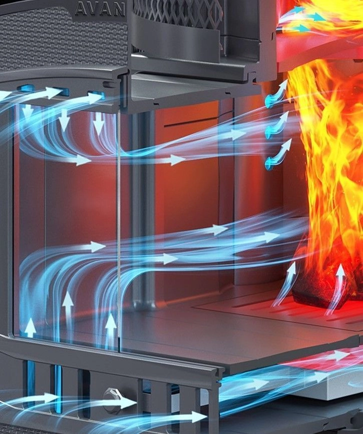 Drzwi panoramiczne z nadmuchem szyby dolnej i górnej pozwalają nie tylko obserwować proces spalania przez czystą szybę ceramiczną, która nie boi się zmian temperatury i zarysowań, ale również bardzo precyzyjnie regulować intensywność spalania za pomocą 2 regulowanych dopływów powietrza.