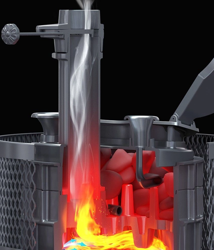 Do produkcji pieca wykorzystujemy kilka rodzajów żeliwa żaroodpornego, w tym o zawartości chromu do 5%. Skład każdej części dobierany jest z uwzględnieniem obciążenia termicznego elementów pieca. Dzięki temu piec Vanguard ma wysoką wytrzymałość i niezawodność.