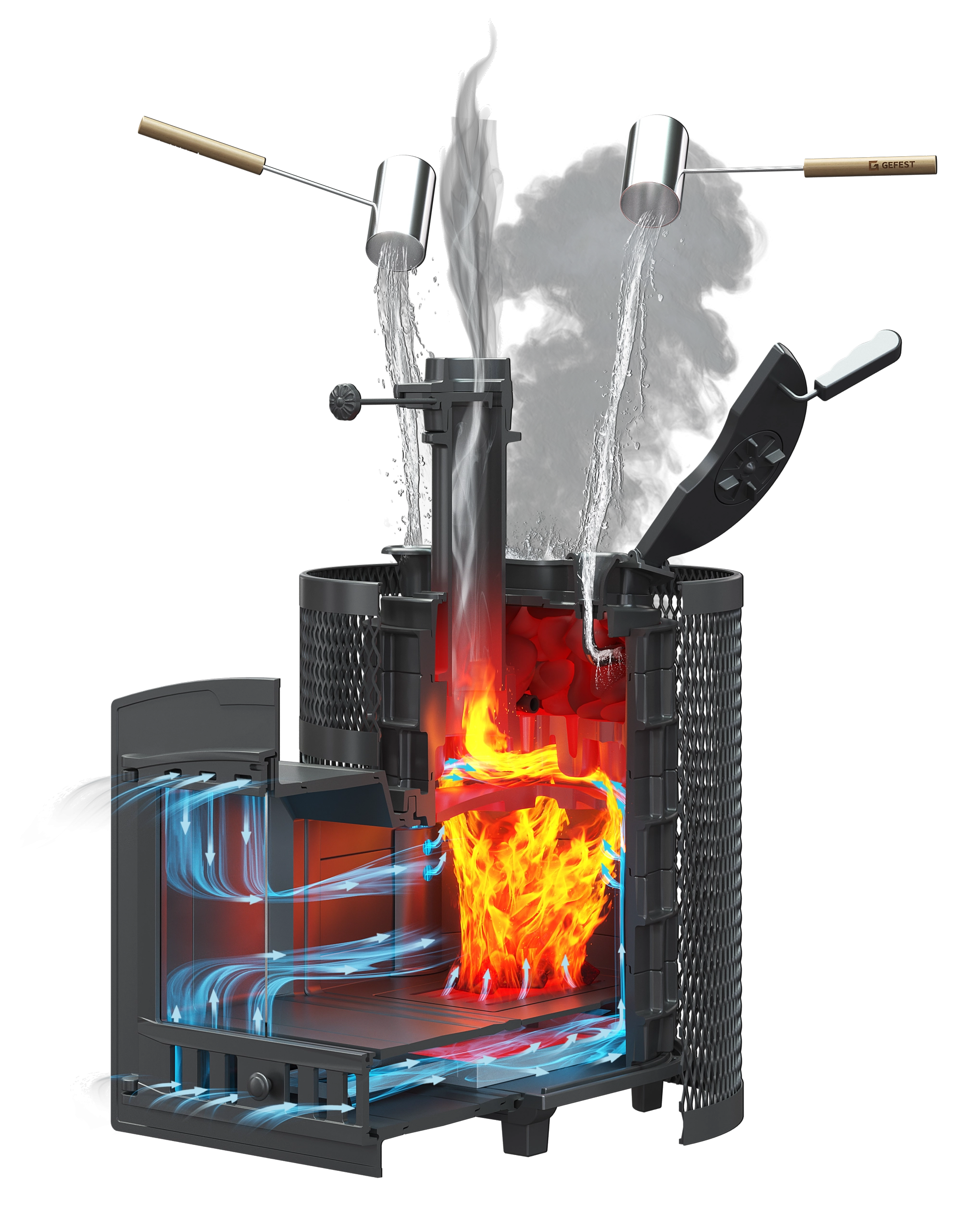 Na 4 przystankach pod nagrzewnicą montowany jest dzielnik płomienia, który dzieli płomień na 3 strumienie i kieruje go najpierw na boczne części korpusu w celu intensywnego nagrzania ścian i konwekcyjnego ogrzewania powietrza w łaźni parowej. W tym celu na zewnętrznych powierzchniach znajdują się żebra konwekcyjne. Ponadto płomień przechodzi przez półki do wyjścia do komina, ogrzewając grzejnik.