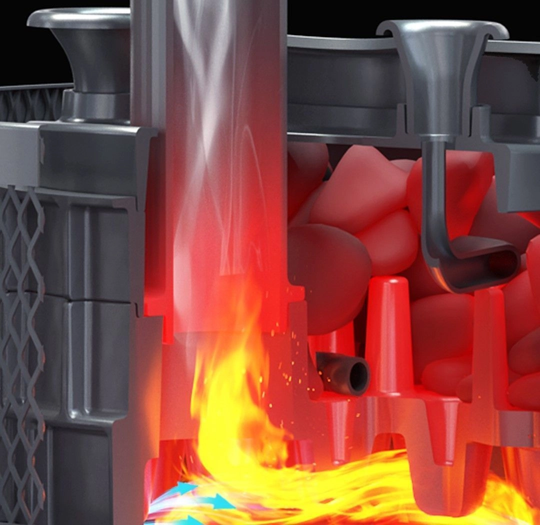 Do produkcji pieca wykorzystujemy kilka rodzajów żeliwa żaroodpornego, w tym o zawartości chromu do 5%. Skład każdej części dobierany jest z uwzględnieniem obciążenia termicznego elementów pieca. Dzięki temu piec Vanguard ma wysoką wytrzymałość i niezawodność.